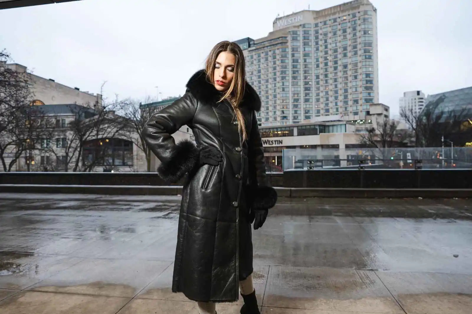 Caitlan’s Black Shearling Sheepskin Full Length Long Coat With Fox Fur Trim